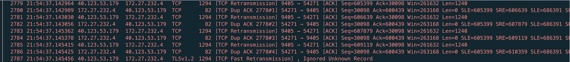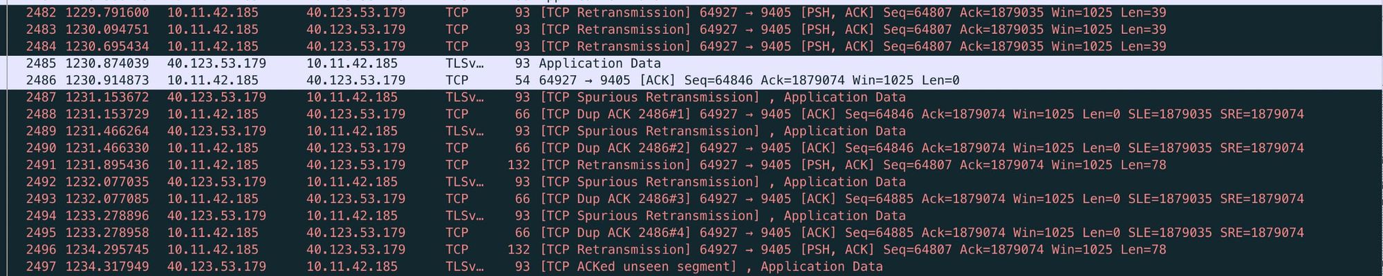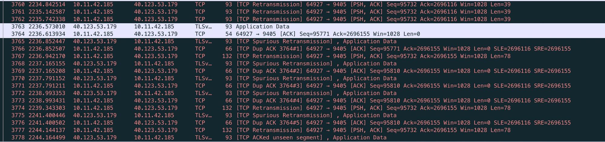 When going through the packet capture I found that a pattern started to emerge. It would start with a series of three TCP Retransmission errors from my local machine to the server, two packets of normal communication and then a series of TCP Spurious Retransmission, TCP DUP ACK and TCP Retransmission errors between my local machine and the server. Finally after a certain time period (anywhere from 3–4 seconds to 8–10 seconds) it would resolve itself.