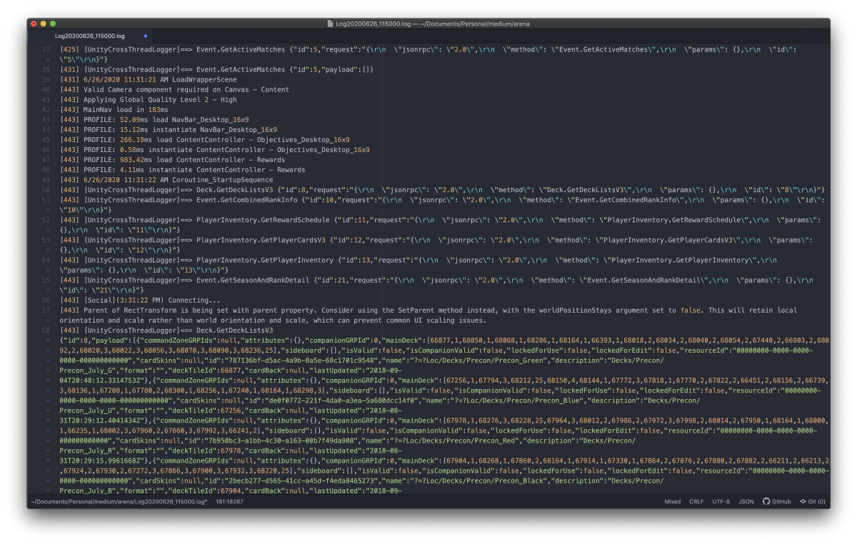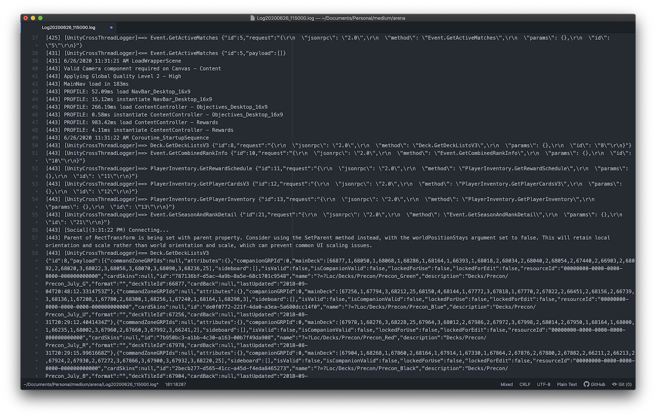 If you’ve ever looked at an MTG: Arena log file you’ve probably noticed that they’re pretty hard to read. Though apparently in the 1.09.01.00 Patch they may have remidaited this, at least by looking at the Patch Notes.