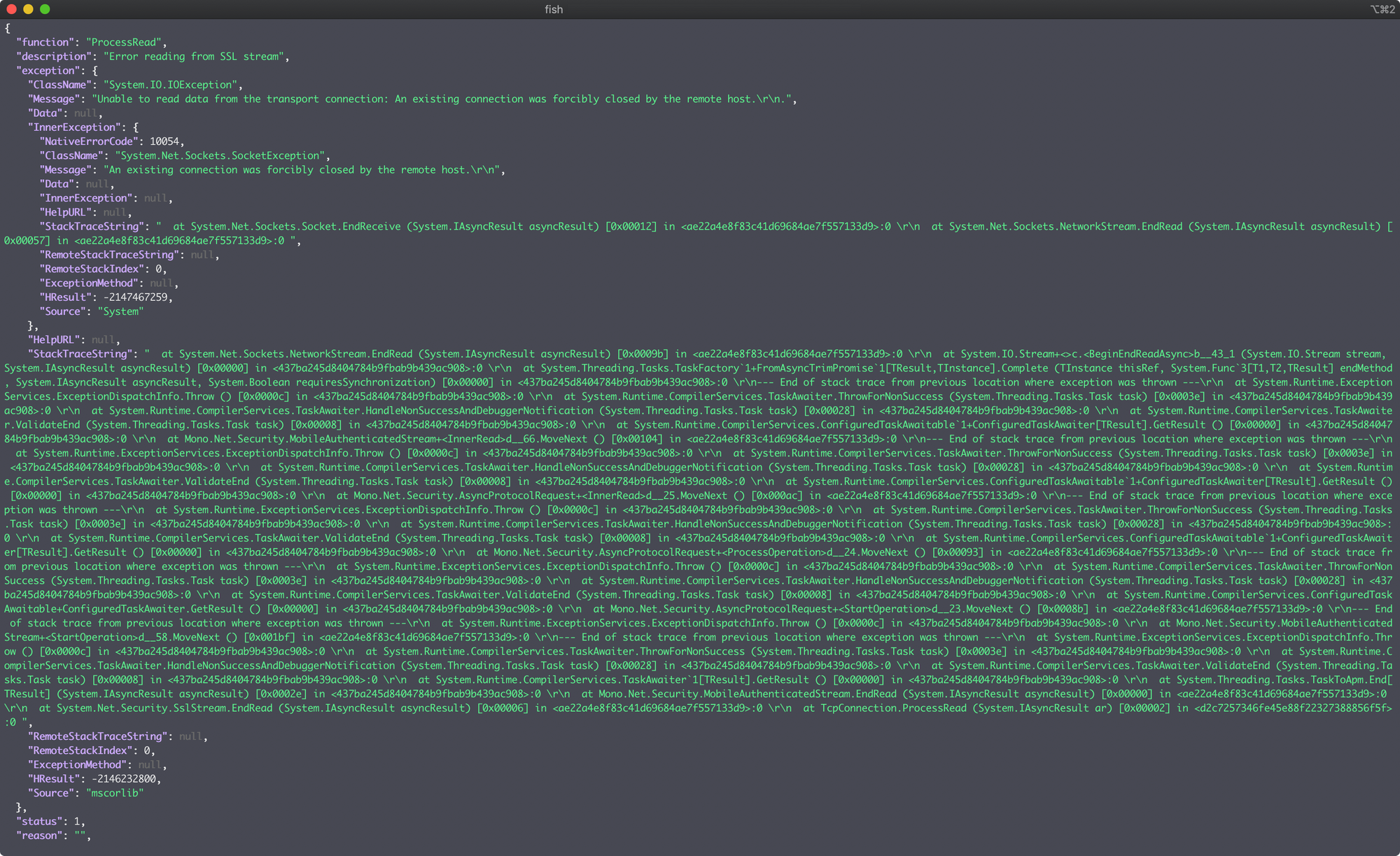 Time to pull out the relevant sections and take a look at them. The first section of the error message tells us pretty succinctly what happened. There was an error reading the SSL stream and the remote host closed the connection.