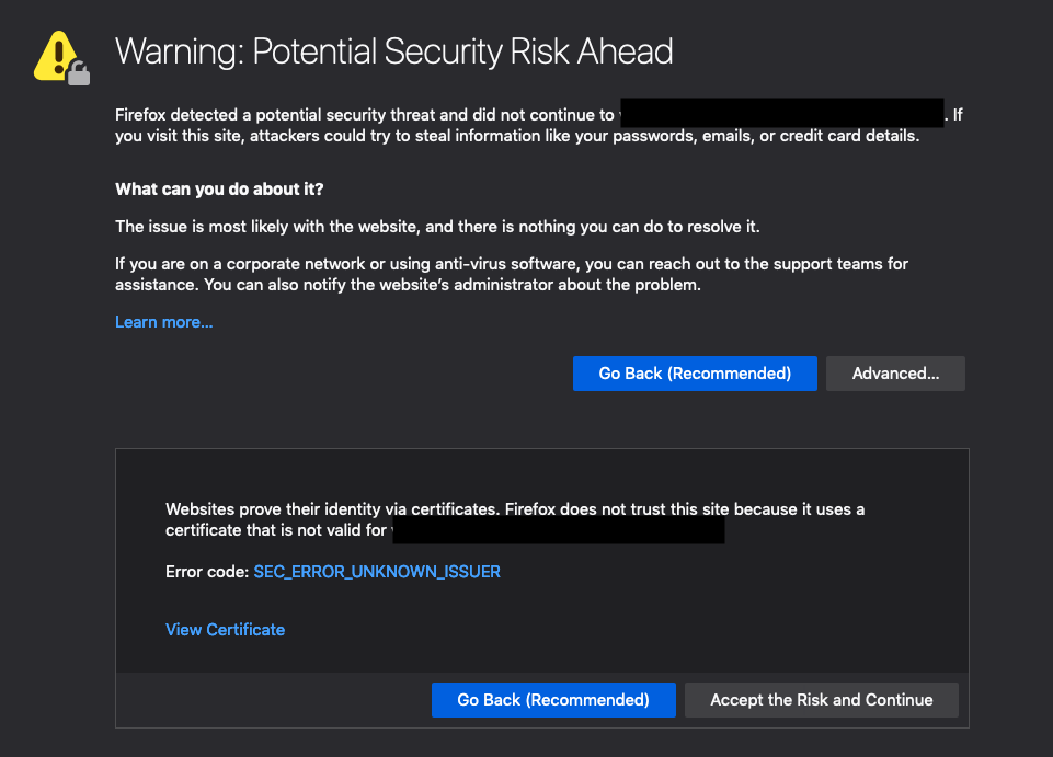 If you get a certificate warning you can ignore it and continue to the page using the option presented in your browser. An example in Firefox is below.
