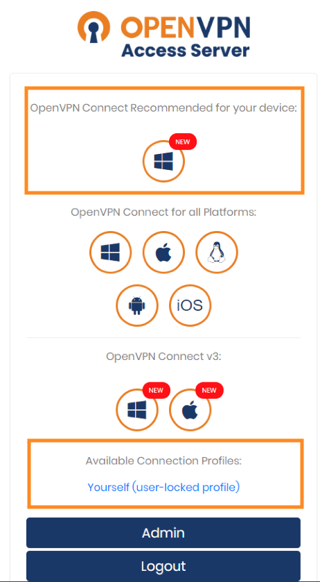 Once you’ve logged in you’ll be presented with a variety of options that looks similar to the ones below. You’ll be downloading two items from here: the executable under OpenVPN Connect Recommended for your device and the user profile named Yourself (user-locked profile).