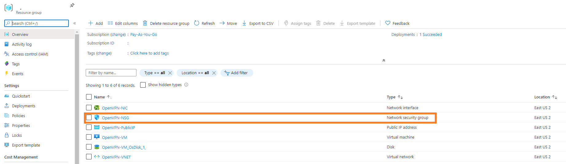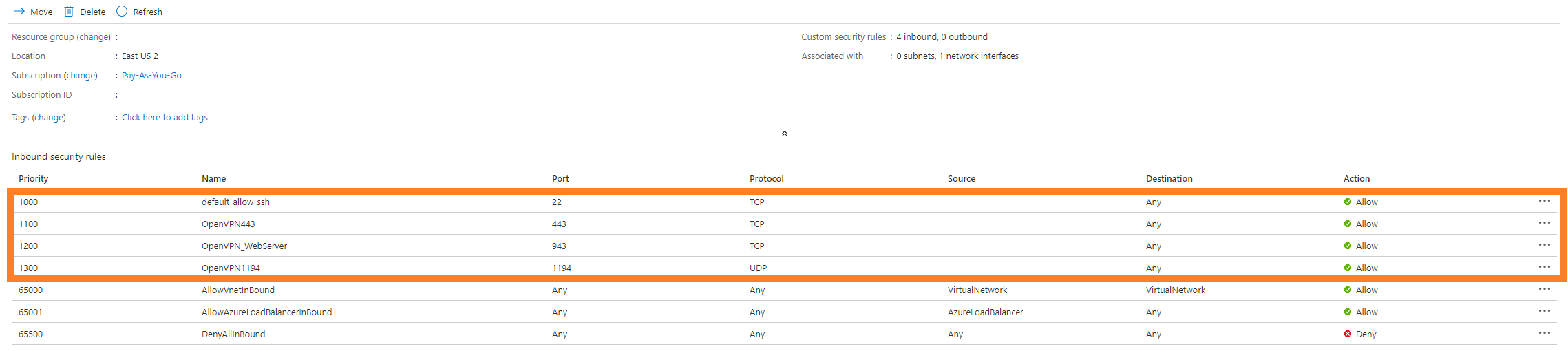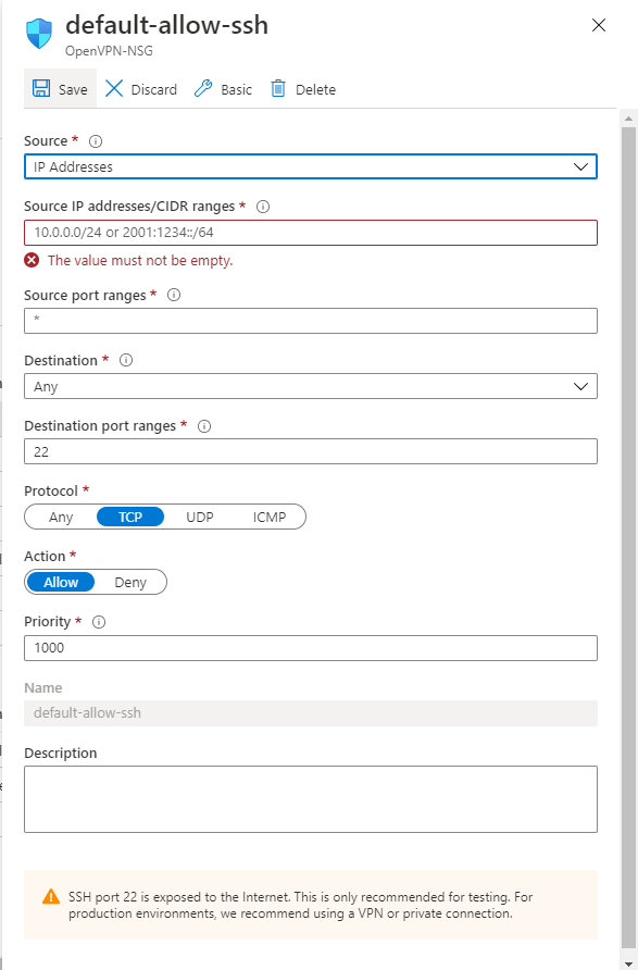 First go to the Resource Groups section of the Azure portal and choose the one you just created. On the next screen you’ll want to click on OpenVPN-NSG.