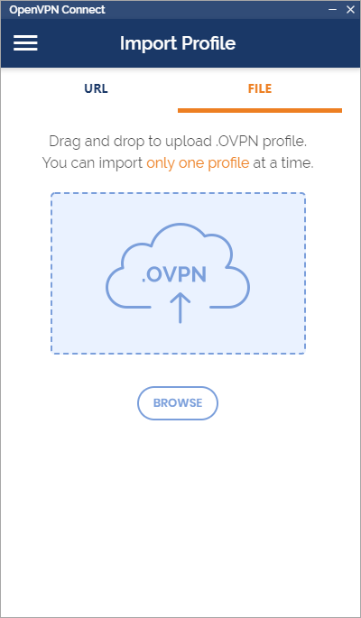 Next you'll want to open the OpenVPN Connect application and choose the File option. Drag and drop the configuration file you just edited onto the indicated area. This will import your configuration.