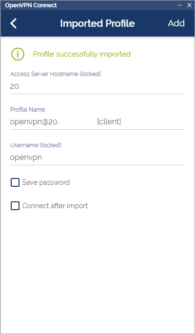 If you want you can check the Save password and Connect after import options and then click the Add button. With that you're good to go! Now you can connect to the VPN server at the click of a button (and the typing of a password).