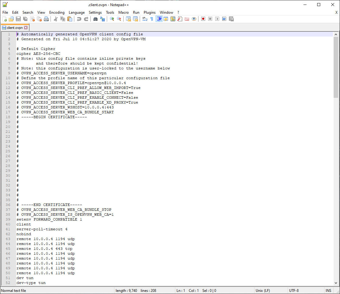 Open up the profile file you downloaded (likely named client) in your text editor of choice. For this I'm going to recommend Notepad++ as I know it works. Other text editors might but I haven't tested them. When you open the file it'll look similar to this though without the giant blank section.