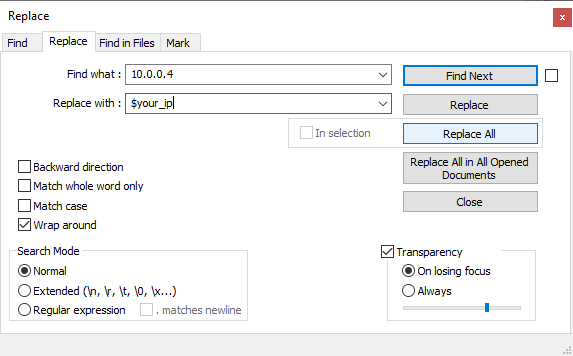 This will bring up a screen like the one below. Type in the IP that came after openvpn@ (might be 10.0.0.4) in the first text box and the IP of your VM in the second text box (the one you wrote down earlier) and press Replace All.