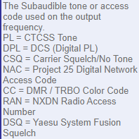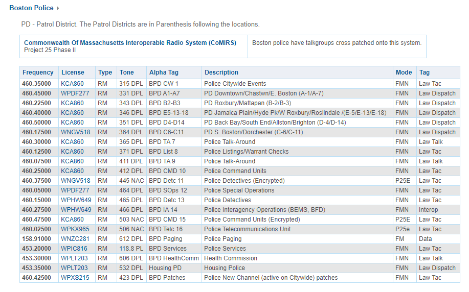For reference here are the frequencies for Boston Police and what the various things in the “tones” column means. As you can see only three of them are NAC but the rest aren’t. If you see DPL, PL or CSQ in the Tone column you can most likely monitor it using the UV-5R.