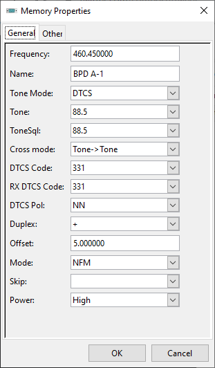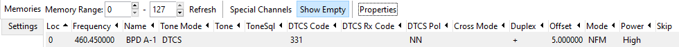 If that looks like a pain in the ass (it is) then click Properties and it’ll be much easier to input data. If your tone mode is DTCS you can skip Tone and ToneSql. If your tone mode is PL then it’s vice versa. Here’s an example of BPD A-1.
