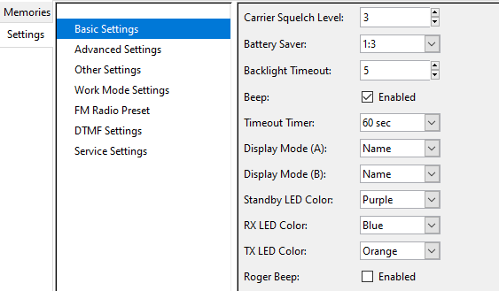 Next is Other Settings. I haven’t tested these myself but if you are not planning on using the FRS channels to talk to other FRS walkie talkies then I would recommend unchecking VHF TX and UHF TX so you don’t accidentally transmit on a frequency you’re not supposed to.