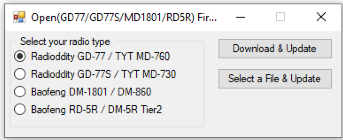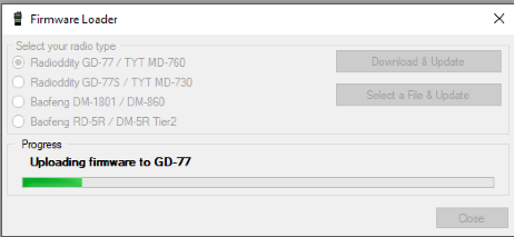 Run FirmwareLoader.exe as an Administrator. Choose your radio type (GD-77) and select either Download & Update or Select a File & Update. If you choose the Download option it will automatically download the latest stable version and install it for you. Otherwise navigate to the firmware file you downloaded.