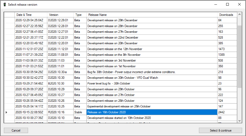 Navigate to Extras -> Firmware Loader and choose your radio version. In this case select Download & Update. Navigate to the latest Stable version and choose Select and Continue.