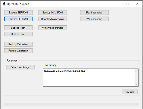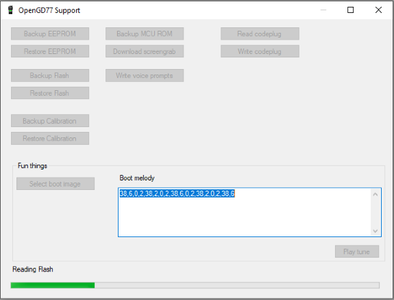 Like before plug in your radio, turn it on and change to a channel that isn't in use. Open up the OpenGD77 CPS and navigate to Extras -> OpenGD77 Support. It should look something like this.