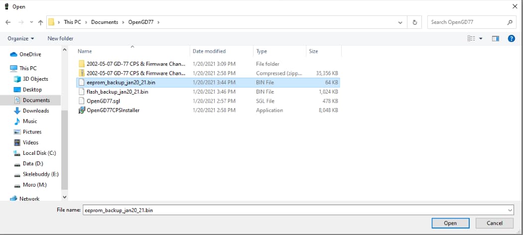 However instead of Backup EEPROM/Flash we're choosing Restore EEPROM/Flash. Start with EEPROM and navigate to where you restored the file and choose Open. Make sure you're selecting the EEPROM file and not the Flash file as they're both .bin files.